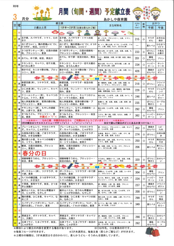 2026年3月の献立表(通常版)を掲載します♪