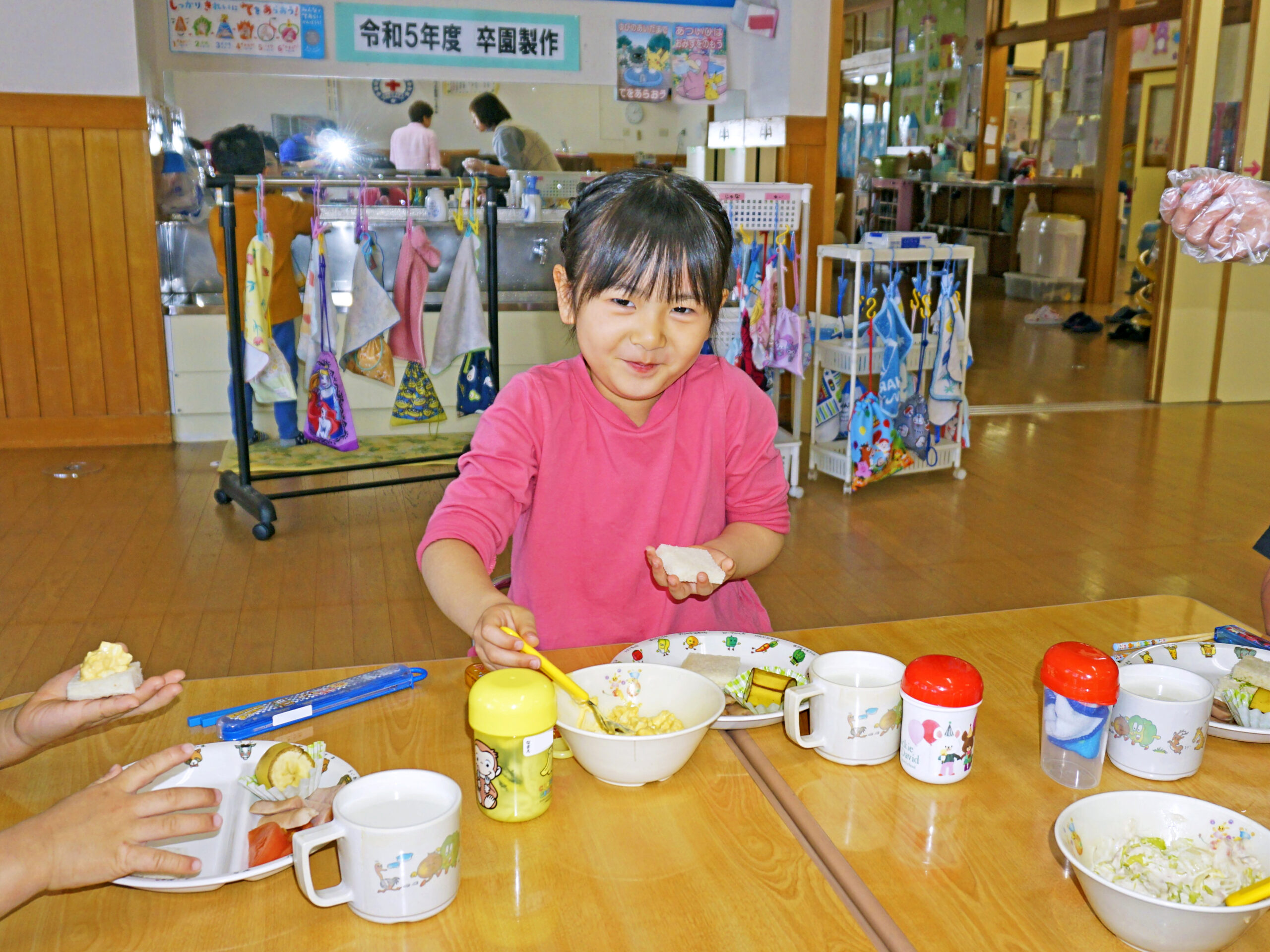 また、当日の体調不良等の場合は消化の良いメニュー等への代替えも可能な場合がありますので、お気軽に登園時にご相談ください。(牛乳や乳製品→麦茶やおせんべい、揚げ物→煮物や油の少ない調理法への変更等など)